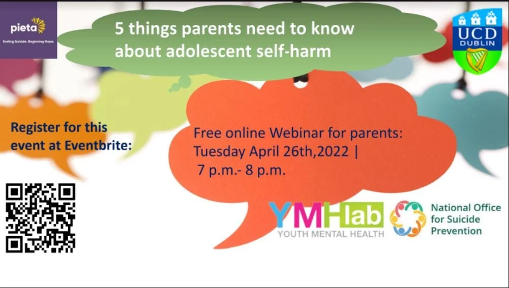 UCD is hosting a final free webinar for anyone interested in learning more about self-harm in adolescents including parents, guardians, or teachers. This webinar will take place online on Tuesday April 26th, 2022 from 7 - 8 p.m. and will discuss our findings from this project and 5 things parents need to know about adolescent self-harm.